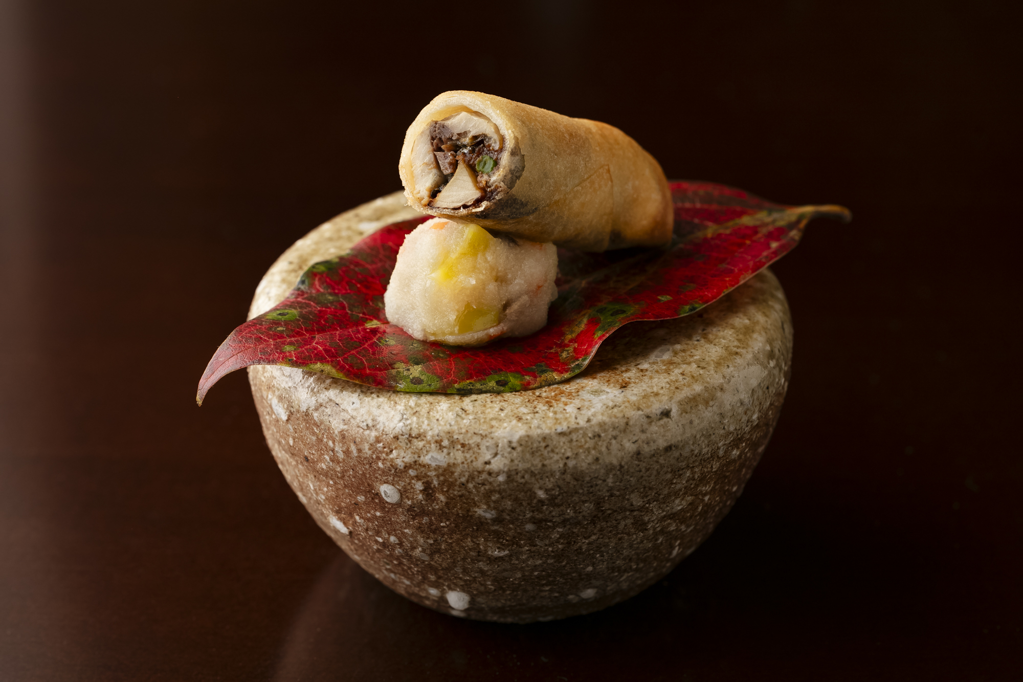「秋刀魚と松茸の秋巻 おから添え」は、秋の春巻料理。マルホン太白胡麻油なしには成り立たない料理だ。秋刀魚を松茸と合わせて赤味噌で味付けし、春巻きの皮で包んで太白胡麻油で揚げる。これまでの日本料理になかった食感、香ばしさ、さらには油の旨味を加えることで、新しい味わいのある料理になる。おからは、たっぷりの太白胡麻油を含ませることなどで豊かに仕上げる。