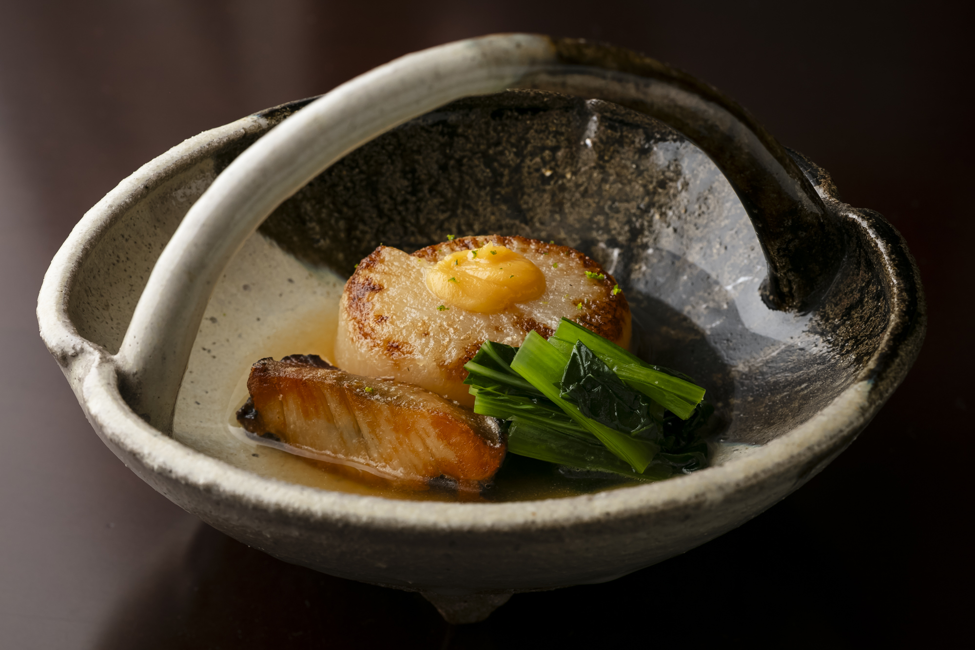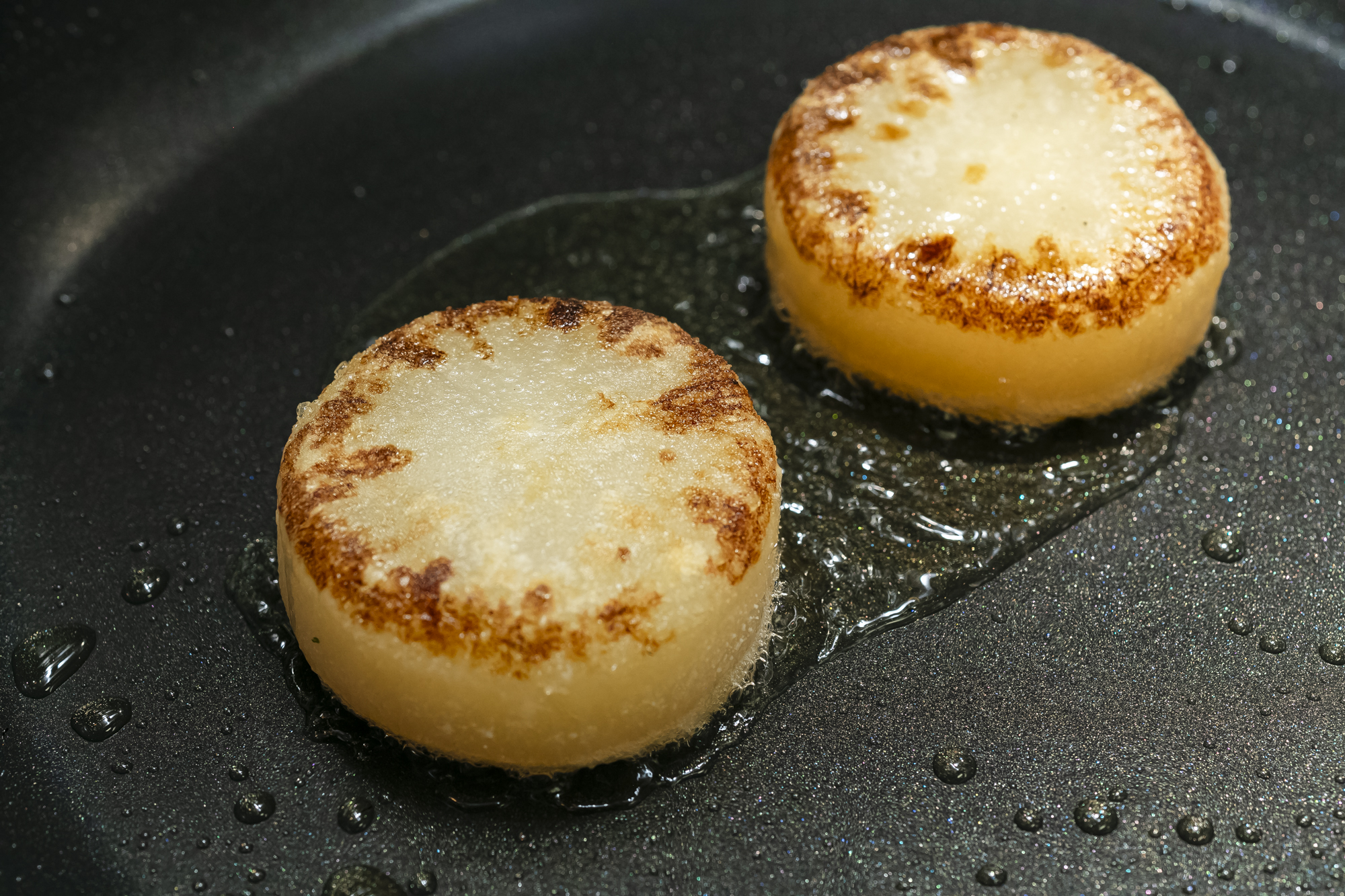 出汁で炊いた大根を太香胡麻油で焼く。上品な風味の胡麻油で焼くことで、大根に官能に訴えるような風味を加える。