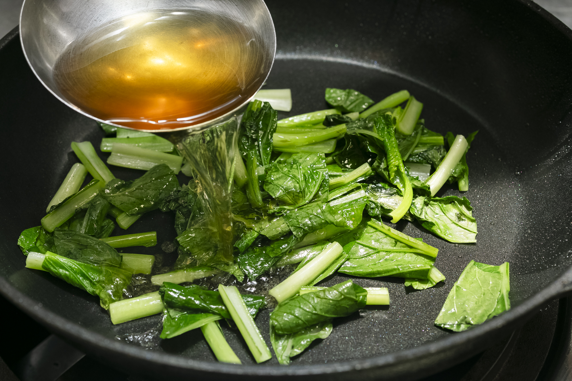 「青菜を炒めることで、青菜の嫌なところが美味しさに変わり、さらに冴えた食感になります。太香胡麻油を使うことで、味に深みが出ますので、日本料理の新しい煮びたしとして魅力のあるものになるわけです」。