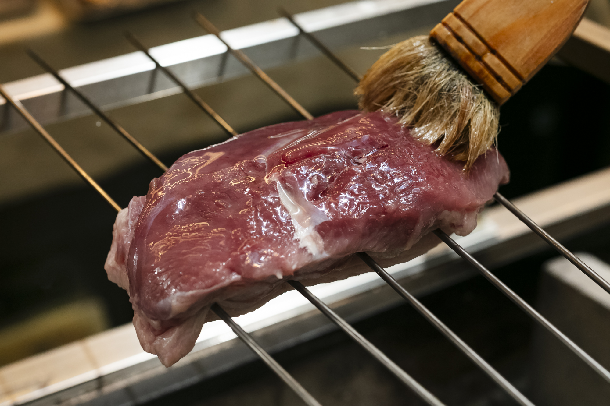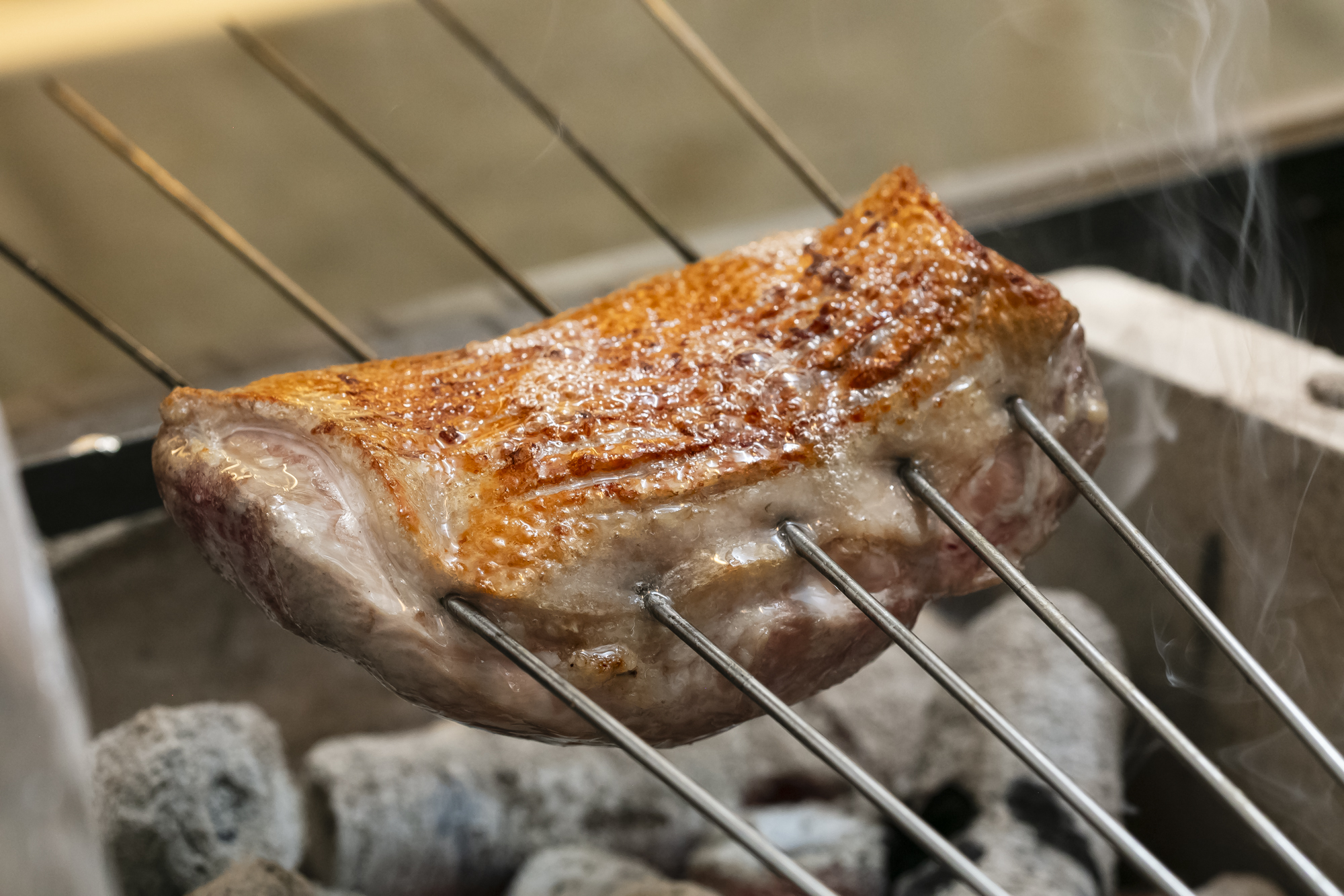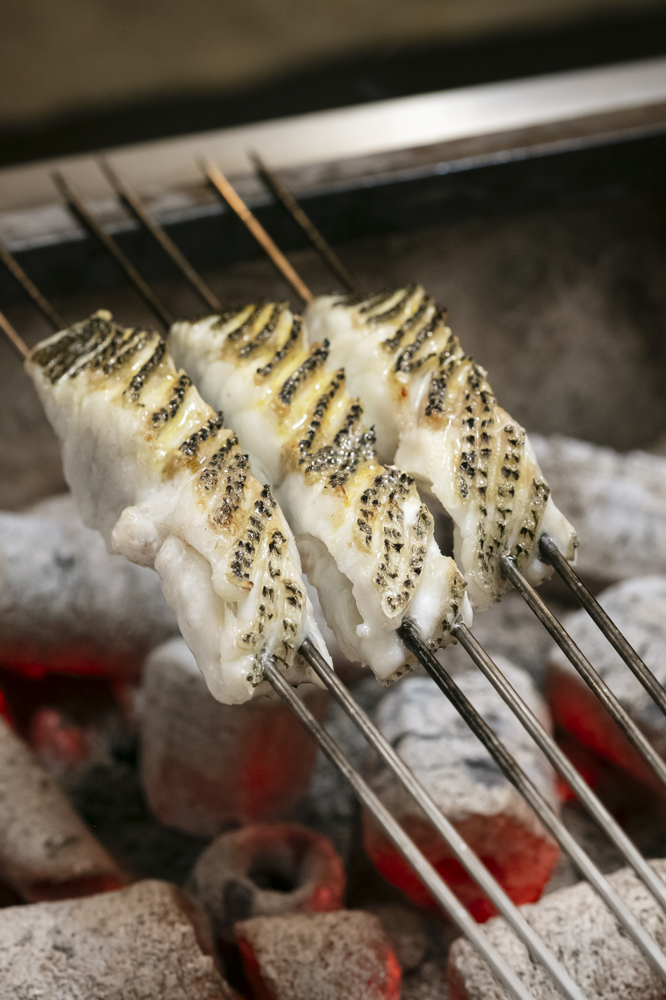 具体的には、180℃に熱した太白胡麻油を、すずきにまわしかけてから炭火で焼く。油で素材をコーティングすることにより、素材の水分を保つことができるので、パサつかず、しっとりと焼き上げることができる。フライパンでも焼けるが、炭火を使うと油が炭に落ち、燻香を魚に纏わせることができるので、より風味がよくなる。