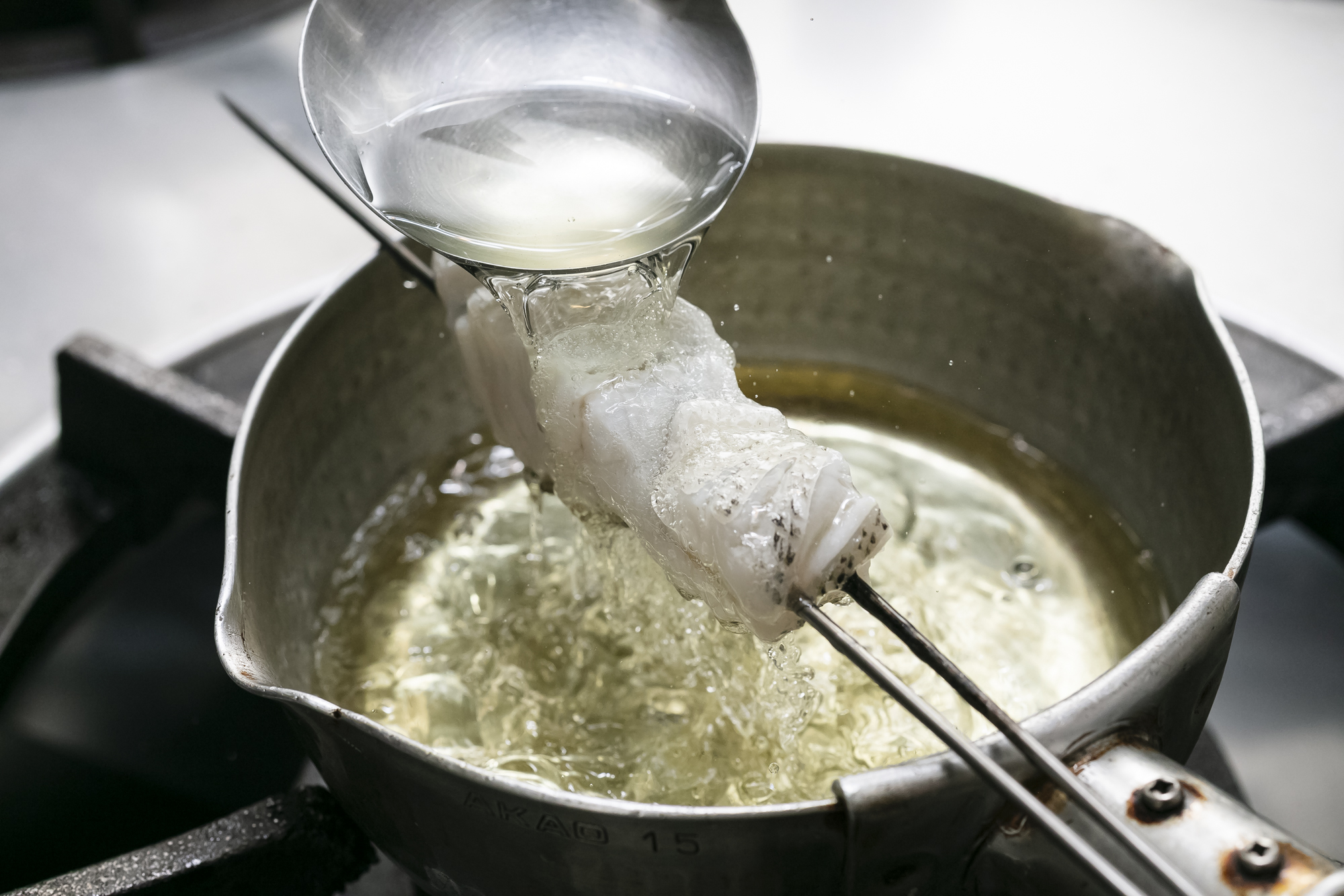 太白胡麻油を使う理由は、「食べたときに油を感じさせずに旨みと香りを加えられるから。ほかの油だとベタついてしまう」と荻野聡士さん。もう一つは、太白胡麻油が高温に強いこと。油が低温だと、魚に油が付きすぎてしまうことを避けられるのだ。