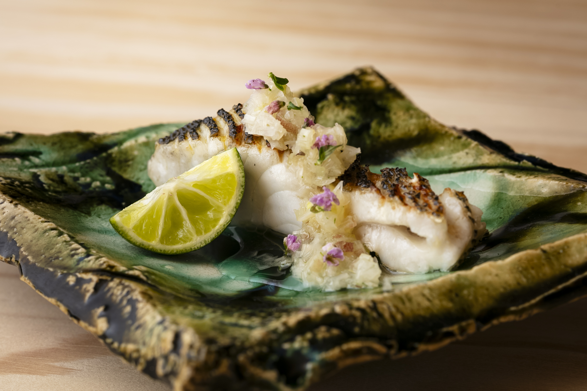 「日本料理においては魚を美味しく焼くことが一番難しい。それを解決する手法が“油焼き”です」と荻野聡士さん。すずき、はた、くえなどの白身魚に特に効果的だという。焼き魚を非日常の味と香りに昇華させる、マルホン太白胡麻油による“油焼き”を解説していただいた。