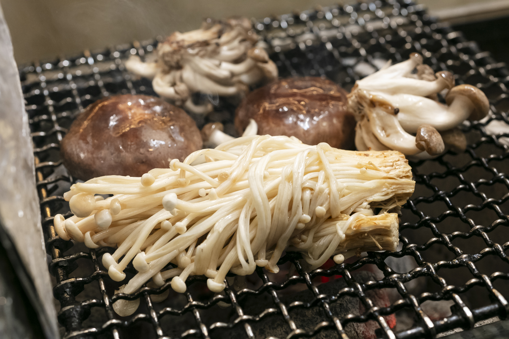 料理の旨味は、きのこが担う。しめじ、えのきなどを塊のまま、たっぷりの太白胡麻油を纏わせてから網を使い炭火で焼く。炭に油を落として立ち上る煙をきのこに纏わせて燻香をつけるのだ。きのこが乾かないように途中にも太白胡麻油を塗りながらじっくりと焼き上げる。すると「きのこの味に厚みが出て、炭の香りをつけることでボリューミーな、ご飯の主役素材になります」と荻野聡士さん。