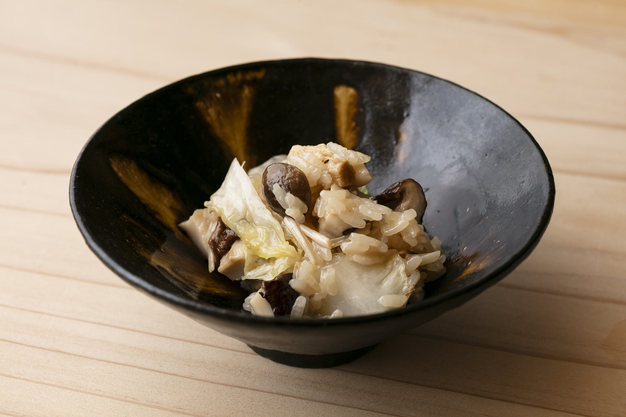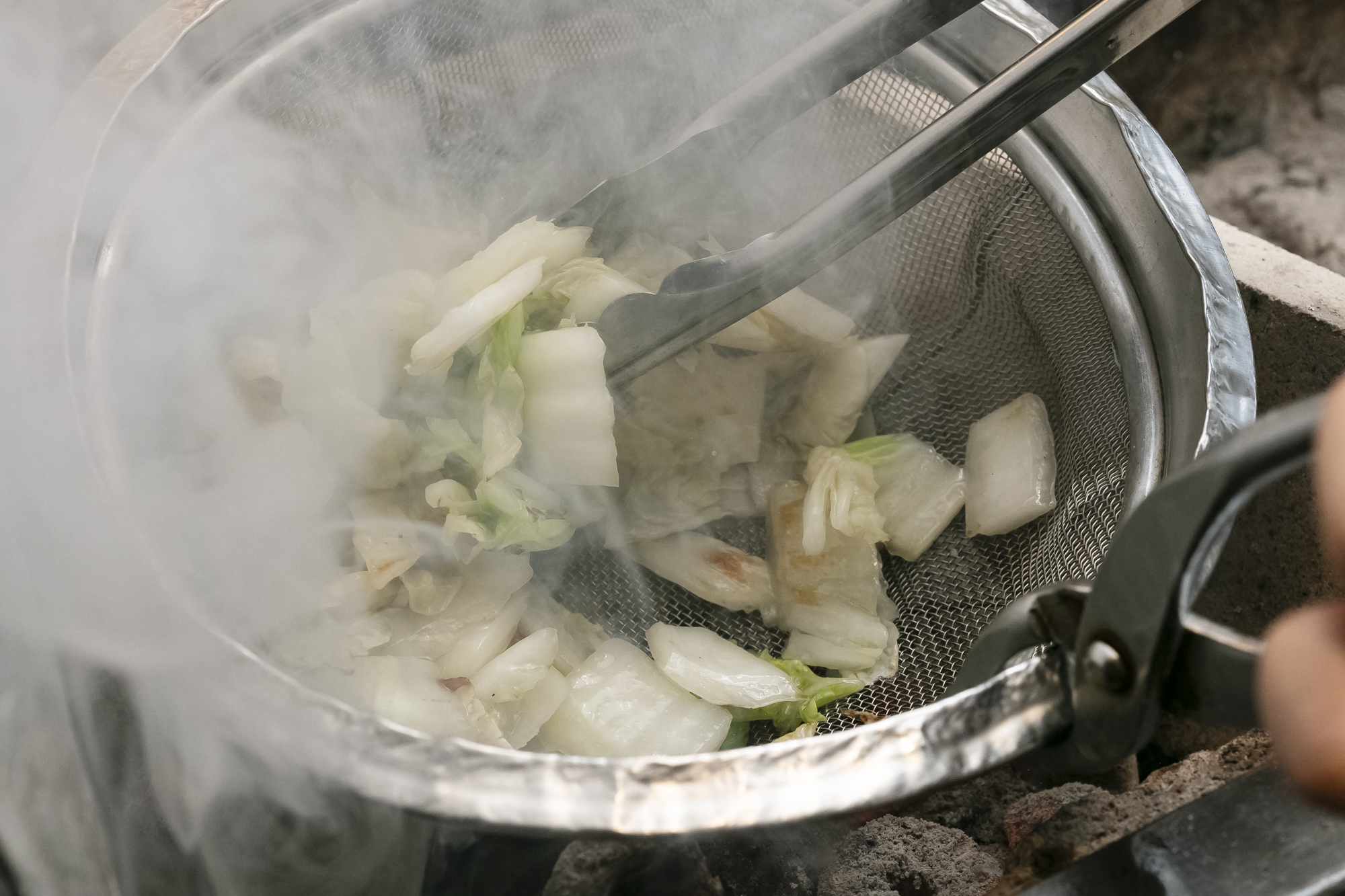 食感は白菜がつくる。刻んだ白菜をたっぷりの太白胡麻油でサッと炒める。油で素材の表面の温度を一気に上げて、シャキッとした食感を出す。さらに上の画像のように、油ごとザルに入れて炭火で炙る。きのこと同様に、炭に油を落として立ち上る煙を白菜に纏わせて燻香をつけるのだ。昆布出汁で炊き上げたご飯に、きのこと白菜を太白胡麻油ごと混ぜる。